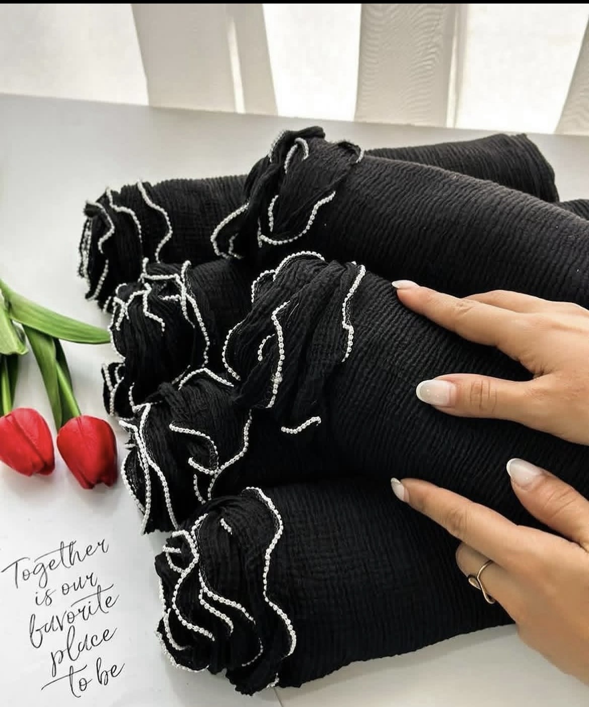 شال پاییزه بوکله وارداتی لبه ریش مدل پولکدار مشکی۶۸۸٬۰۰۰ تومان