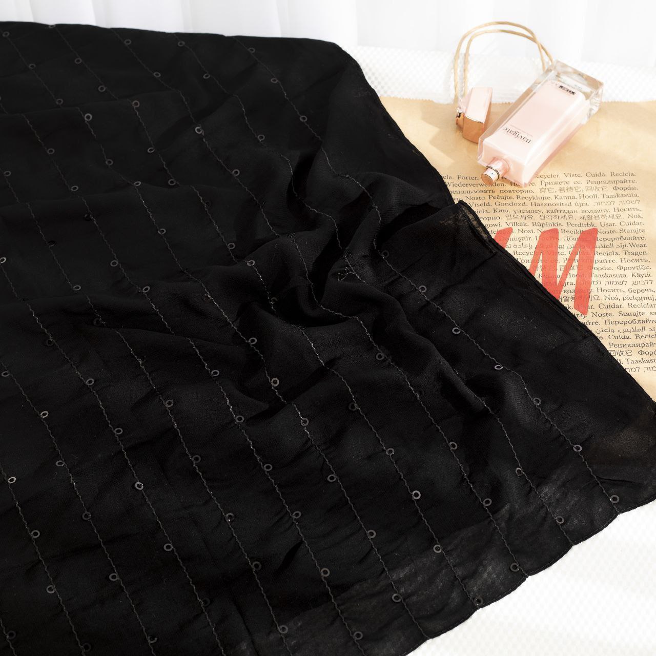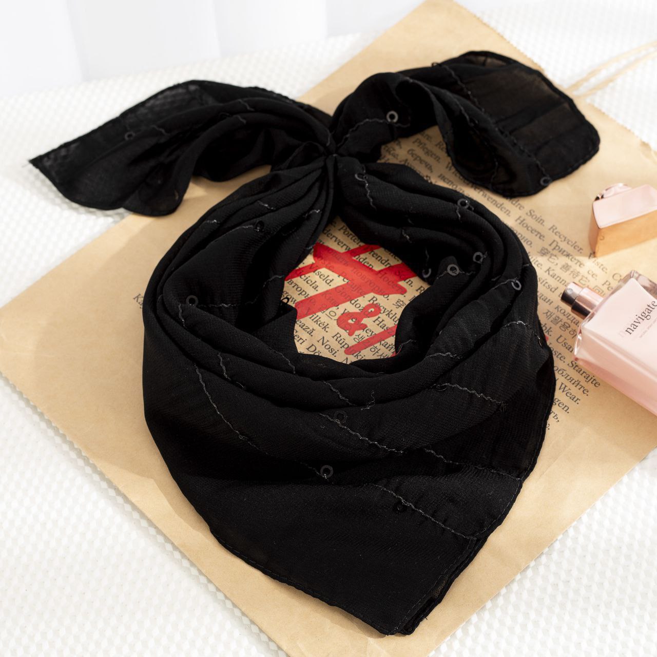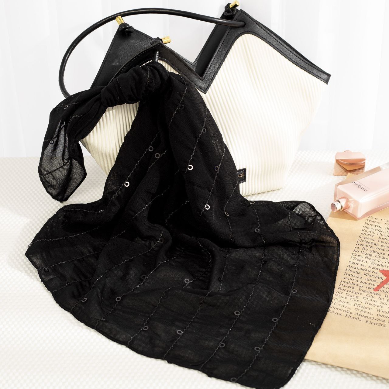 مینی اسکارف مشکی پولکی مزونی یکی از شیکترین اکسسوریهای زنانه است که برای استایلهای رسمی، مجلسی و مزونی انتخابی ایدهآل محسوب میشود. این اسکارف با جنس لطیف، سبک و ایستایی عالی طراحی شده و وجود پولکهای ظریف و درخشان جلوهای لوکس و چشمگیر به آن میبخشد. رنگ مشکی باعث شده این مدل با انواع لباسهای مزونی، مانتوهای مجلسی، کتوشلوار زنانه و حتی استایلهای ساده روزمره بهراحتی ست شود.